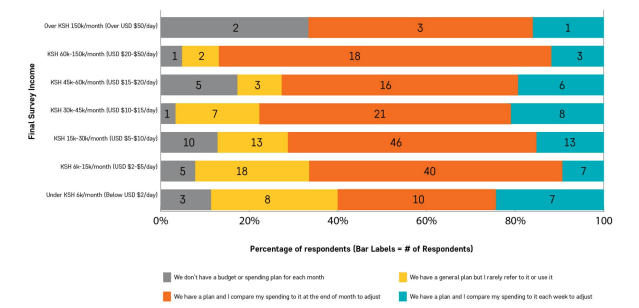 Living with uncertainty, the majority of Tala’s users have become active money managers with monthly budgets. This is resonant with the findings from FSD Kenya‘s seminal work in the Kenya Financial Diaries. In fact, as the chart below indicates, our customers in the lowest income brackets are the most likely to budget and monitor their spending regularly.