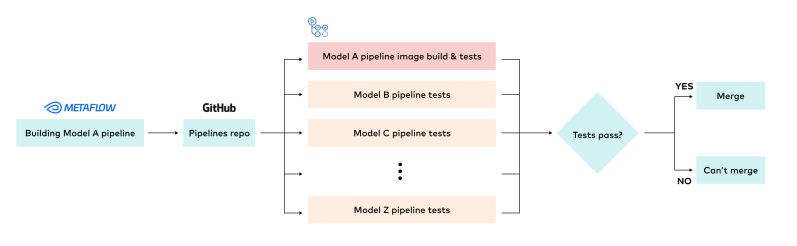 The goal of tests is to safeguard against software regressions. For every model in production or close to deployment, tests are automatically triggered on relevant pull requests as part of the CI/CD workflow for each pipeline. The tests run in parallel across multiple pipelines simultaneously. For any single pipeline, the tests also run in parallel across markets. We have the flexibility to choose whether to run the tests locally (on a GitHub runner) or on a Kubernetes cluster.