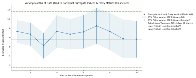 As shown in the above plot, the 95% confidence interval for the observed average treatment effect on our long-term outcome of interest (i.e., the green dotted lines) ranged from approximately 0 to 12. Whereas, the 95% confidence interval for the 1-month surrogate index estimate of the ATE (i.e., the leftmost blue vertical lines) ranged from approximately 5 to 10. That is, in our application, like in the authors’, the surrogate index yielded a substantial increase in precision — in our case, a 58% reduction in the width of the confidence interval. We observed similar increases in precision across our remaining validation analyses. As the authors pointed out, “the results imply that it is optimal to use the smallest set of surrogates that satisfy the surrogacy assumption to maximize efficiency.”