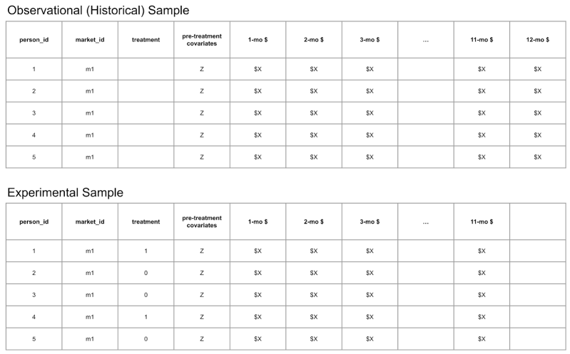 The historical observational dataset includes the long-term outcome of interest and early measures of the long-term outcome (aka short-term proxies). It may also include additional predictor variables. Notably, it doesn’t include a treatment group indicator because the data are not from an experiment. For example, if the long-term outcome is the total amount of money repaid minus the total amount of money loaned (aka credit margin) one year after a loan was disbursed to a borrower, then early measures of this outcome might be monthly values of this quantity at one month after loan disbursement, two months after loan disbursement, and so on up to the value at eleven months after loan disbursement. So, for this example, the historical observational dataset would contain the twelve monthly values of credit margin for a set of loans disbursed well before the period of experimentation.