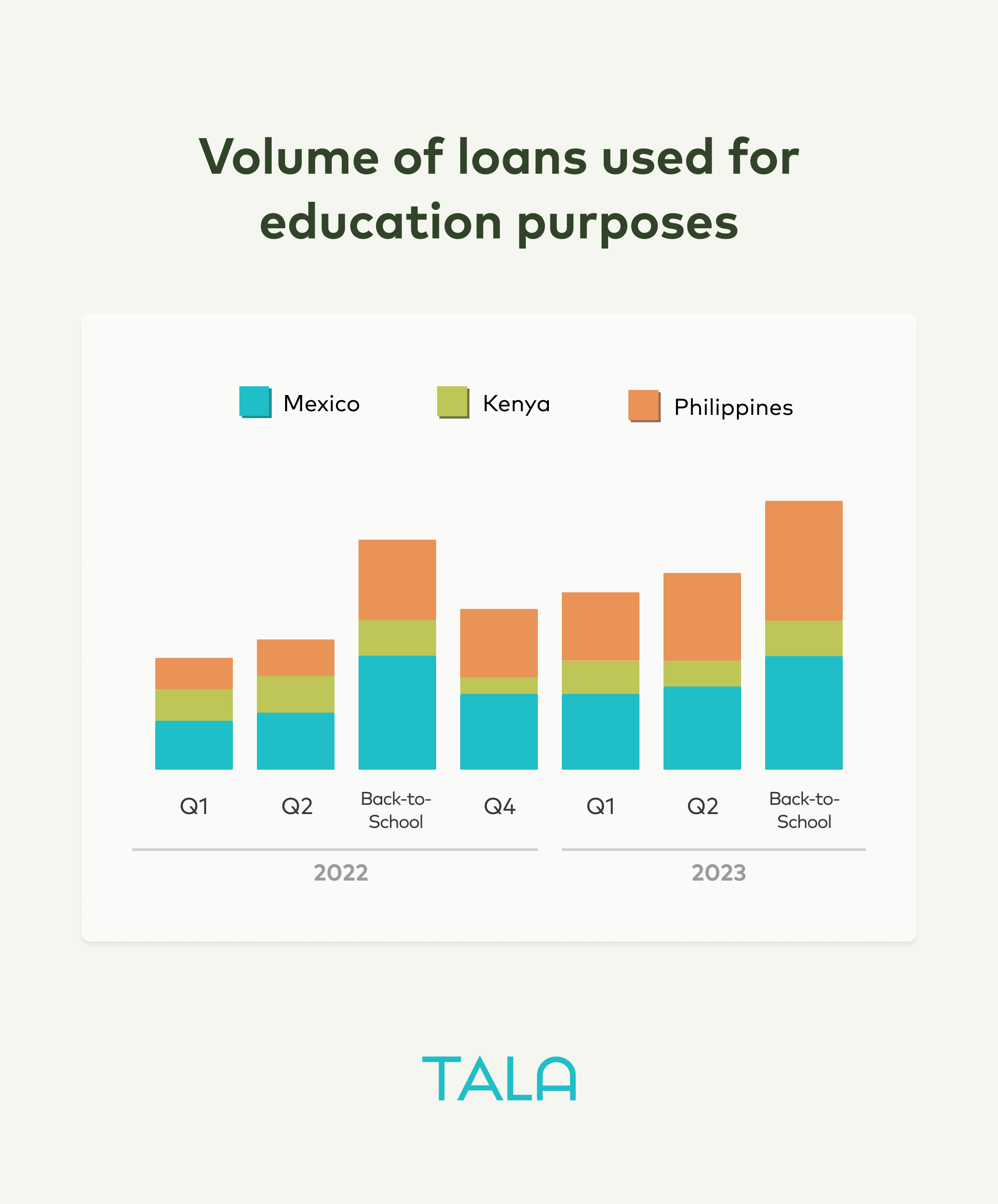 Every late summer, Tala sees a flux of customer activity as families prepare to send their kids back to school. Each school year brings up-front expenses, from school fees to supplies to clothing and uniforms — often stretching our customers’ household budgets. With rising education costs, we’ve seen a subsequent increase in loan demand. According to Tala’s anonymized, self-reported data from loan applications over the last several years, the number of loans taken for education purposes increases by nearly 50% during back-to-school months.